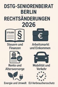 Der DSTG-Seniorenbeirat Berlin informiert im DSTG-Senioren-Info 3/26 vom 22. Januar 2026 über Rechtsänderungen 2026, die unterschiedliche Bereiche des täglichen Lebens betreffen und zeigt auf, was sich konkret für Verbraucher und Bürger im Laufe des Jahres ändert.